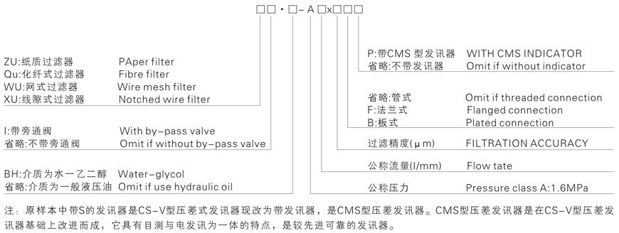 注:*為過濾精度,若使用介質為水一乙二醇,帶發訊器,過濾器型號為:XU·BH-A63×*P,濾芯型號為TXX·BH-63×*。