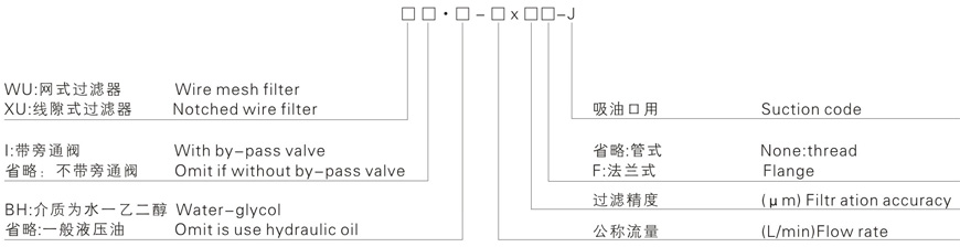 注:*為過濾精度,若使用介質為水一乙二醇。帶旁通閥。公稱流量100L/min,過濾精度80μm,帶則過濾器型號為:WUI·BH-100×*-J |